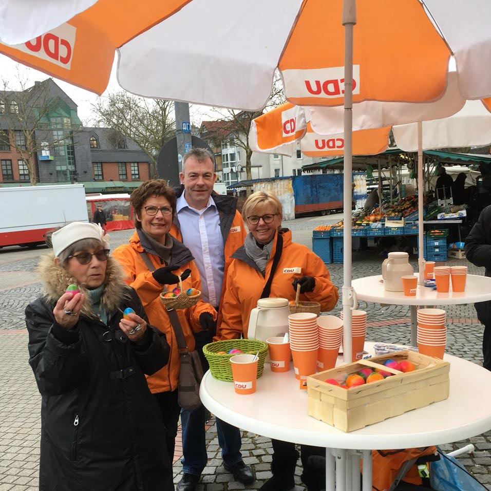 Bei frischen Vorfrühlingstemperaturen wurden am Gründonnerstag auf dem Langendreerer Markt 300 Ostereier verteilt. Ein wärmender Kaffee für alle Gesprächsteilnehmer war da herzlich willkommen.