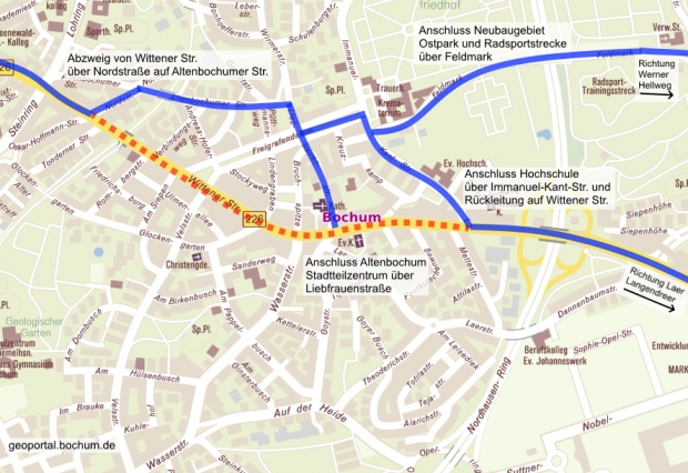 5. Für Altenbochum passierende Radfahrer sind die Wege nach Langendreer nahezu gleich lang (1,40 km zu 1,49 km), für Radfahrer in Richtung Werner sogar kürzer als über die Wittener Straße. Das Stadtteilzentrum in Altenbochum kann über die Liebfrauenstraße erreicht werden.