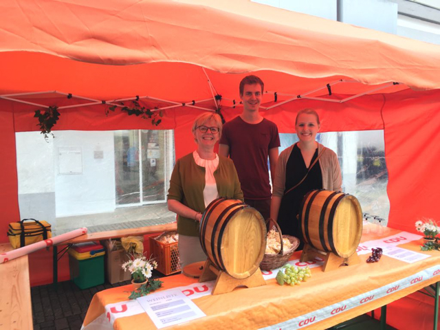 Mittendrin bot die CDU traditionsgemäß wieder verschiedene Weine in allen Farben zum Freundschaftspreis an. Dieses Angebot wurde reichlich in Anspruch genommen und die Organisatoren konnten viele Gespräche, kritische wie auch aufmunternde, mit den Bürgern führen.Über den Tag verteilt halfen dabei viele Freiwillige beim auf- und Abbbau sowie am Hahn der Weinfässer.