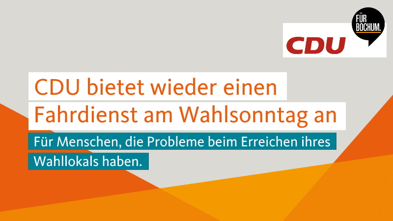 Die CDU Bochum bietet zur Kommunalwahl am kommenden Sonntag, dem 13. September, wieder einen Fahrdienst für Mitbürger an, die Schwierigkeiten bei der Bewältigung des Weges zum Wahllokal haben.