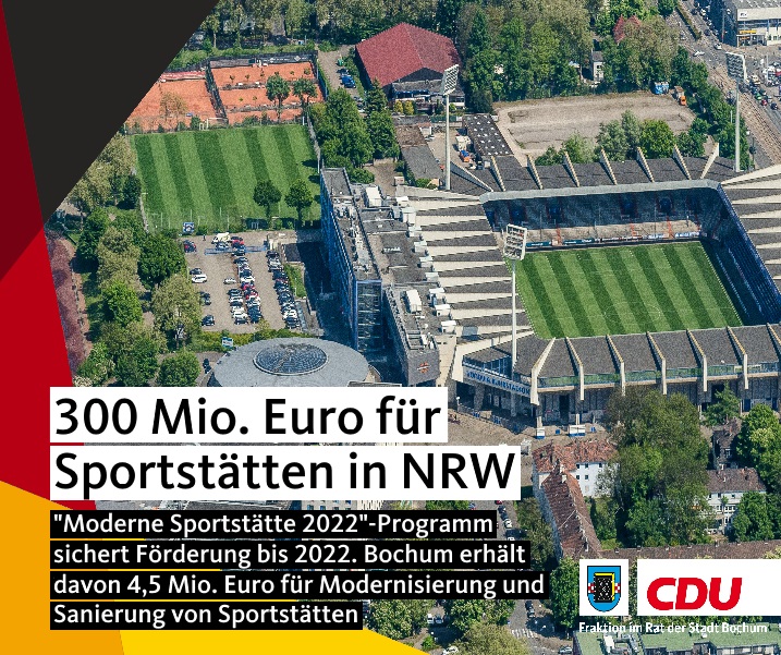 Dazu erklärt CDU-Ratsmitglied und Vorsitzender des Sportausschusses Wolfgang Horneck: „So eine hohe Förderung für den Sport hat es in Nordrhein-Westfalen bislang noch nicht gegeben. Bochum bekommt für die Modernisierung und Sanierung seiner Sportstätten insgesamt 4,5 Mio. Euro. Sportvereinen, Stadt- und Gemeindesport-verbänden, Kreis- und Stadtsportbünde und Sportverbänden in NRW stehen bis 2022 nunmehr insgesamt 300 Millionen Euro zur Verfügung. Davon werden 30 Millionen Euro für 2019 veranschlagt, die weiteren 270 Millionen als Verpflichtungsermächtigung bis 2022.“